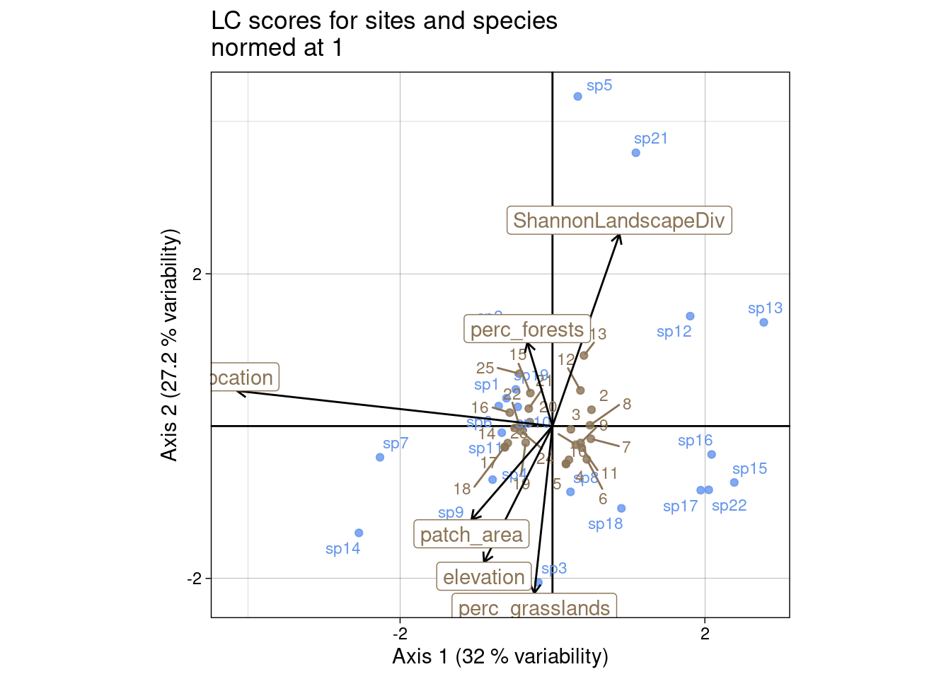ggtitle("LC scores for sites and species\nnormed at 1")