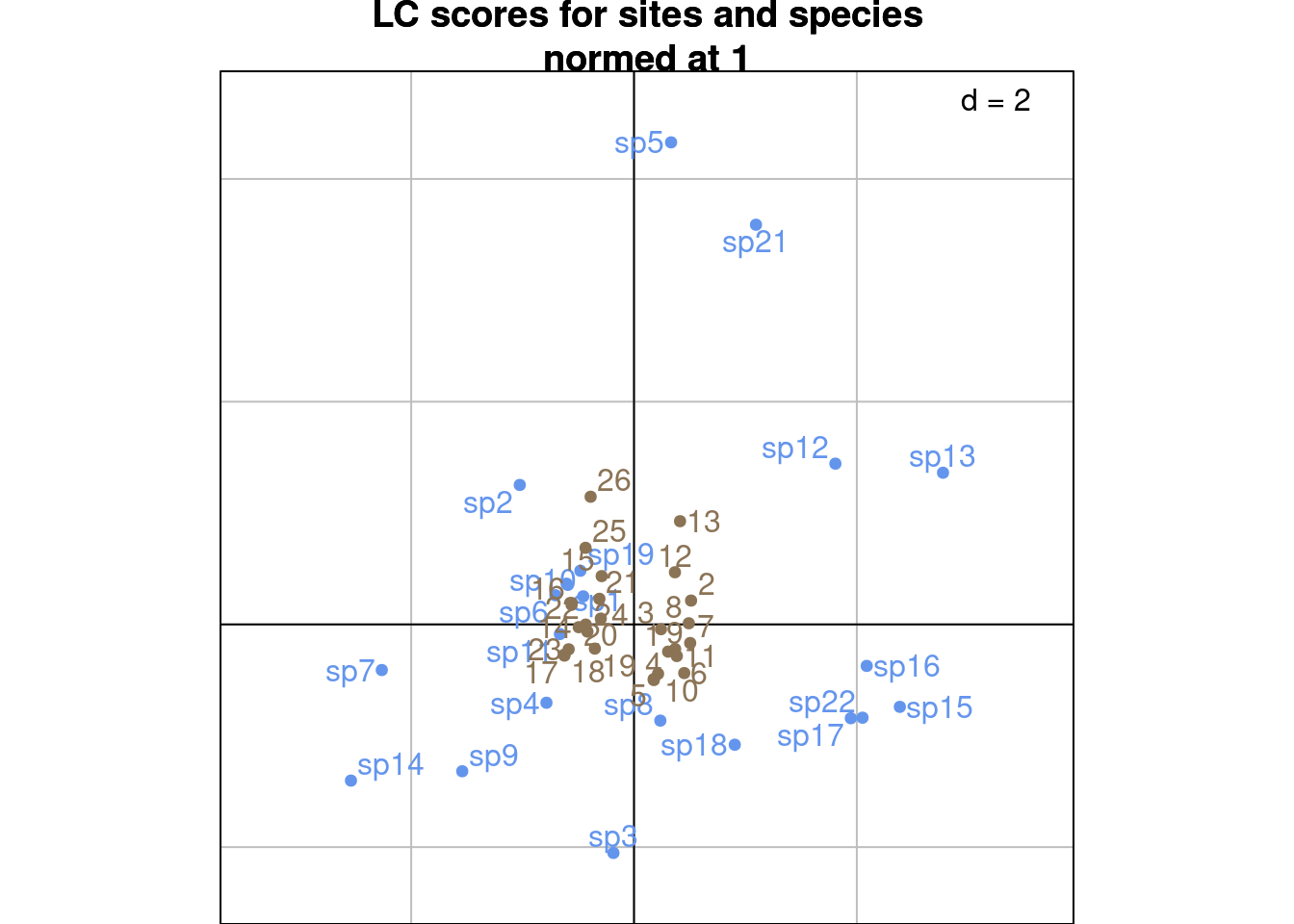 main = "LC scores for sites and species\nnormed at 1")