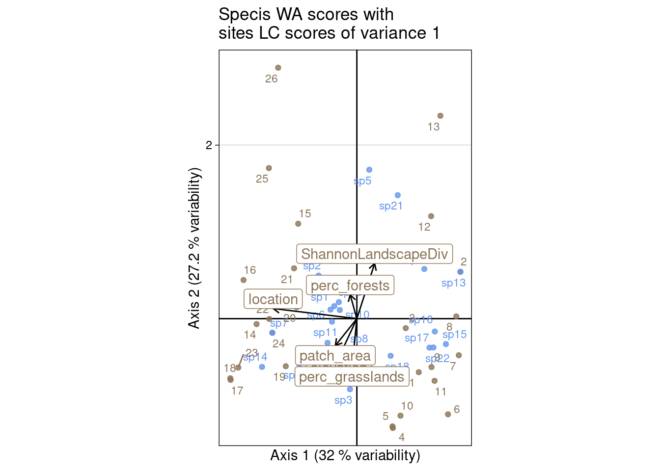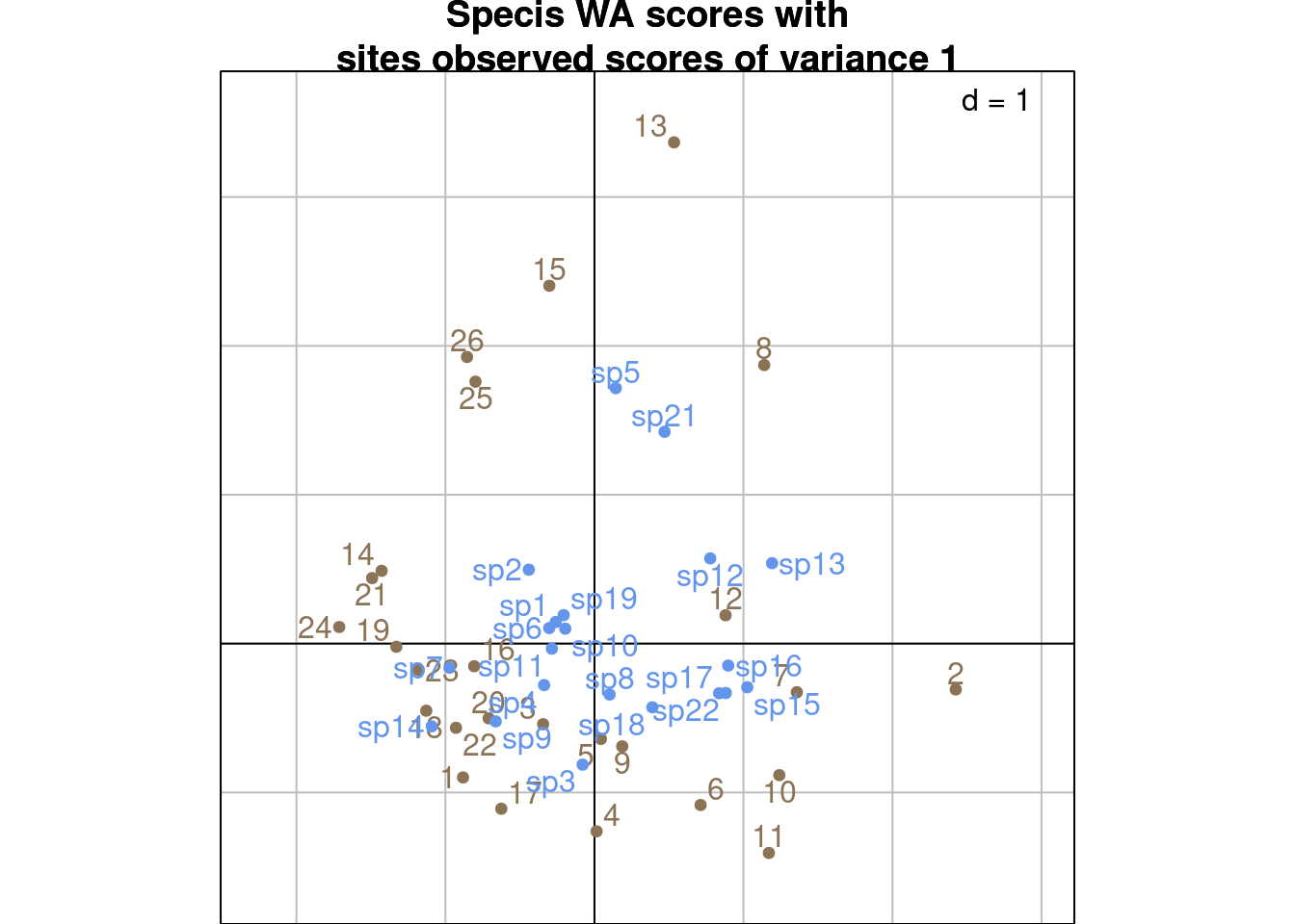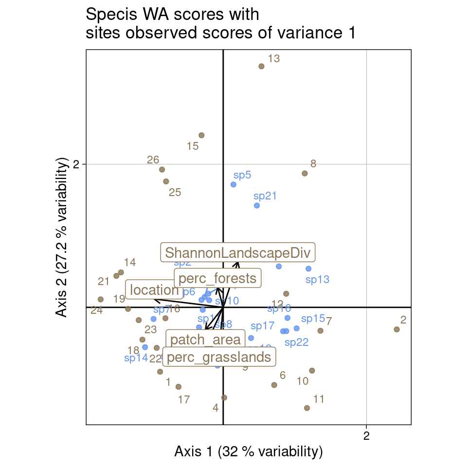 ggtitle("Specis WA scores with\nsites LC scores of variance 1")