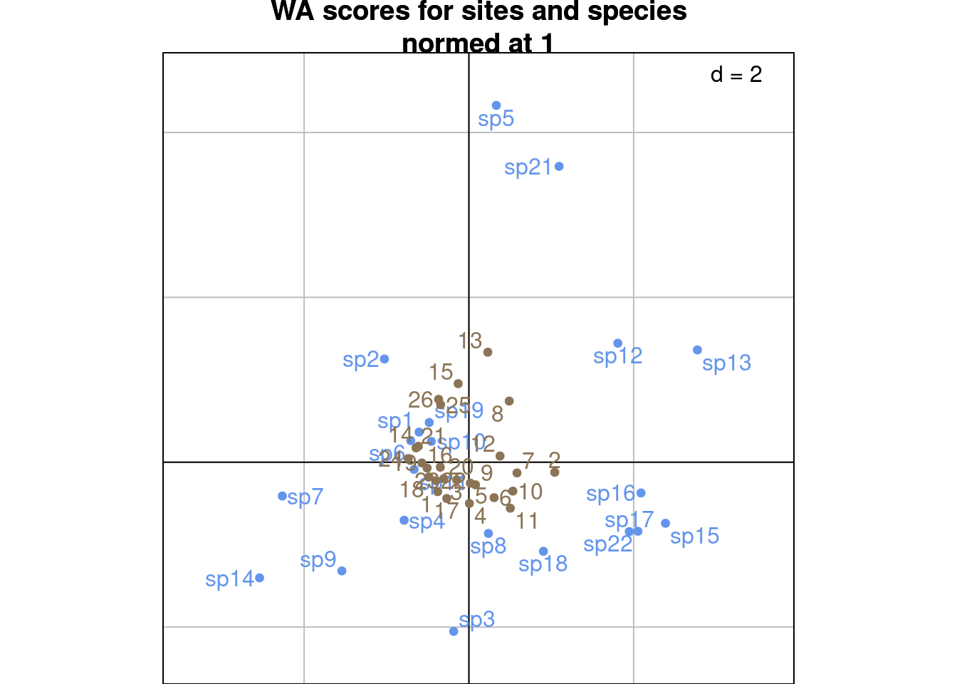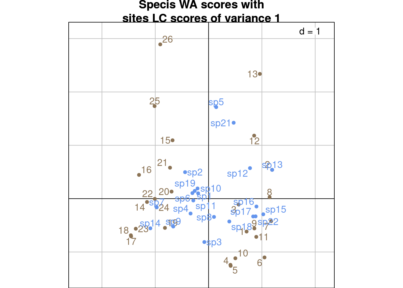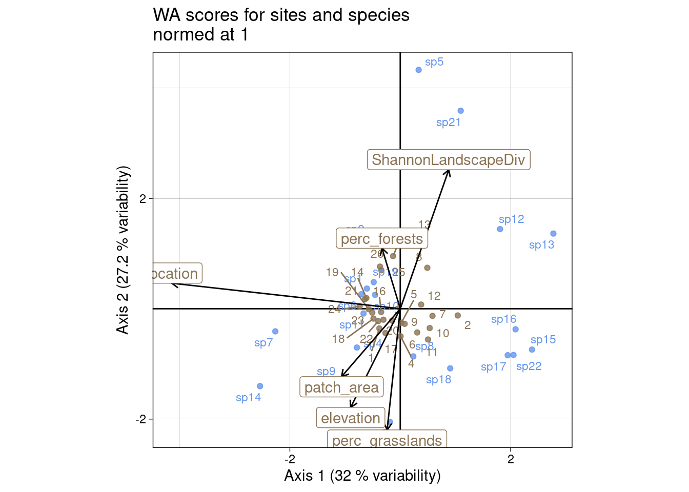 ggtitle("Specis WA scores with\nsites LC scores of variance 1")