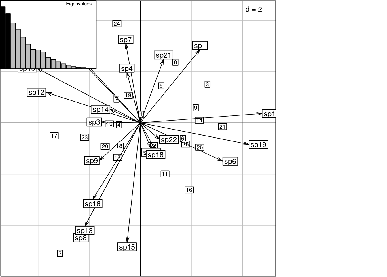 s.label(cca$c1, # Species constrained at variance 1