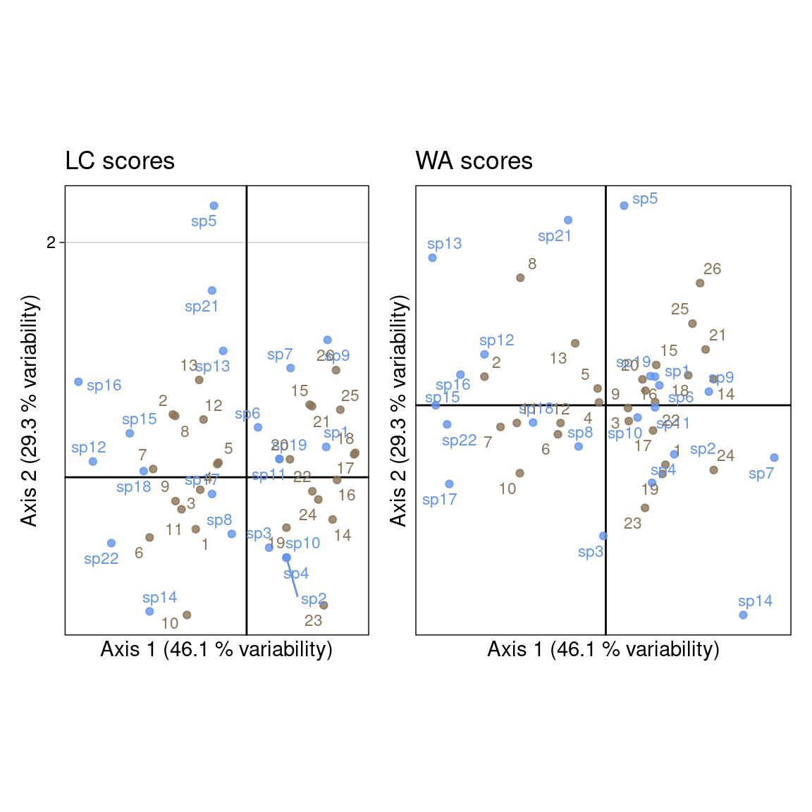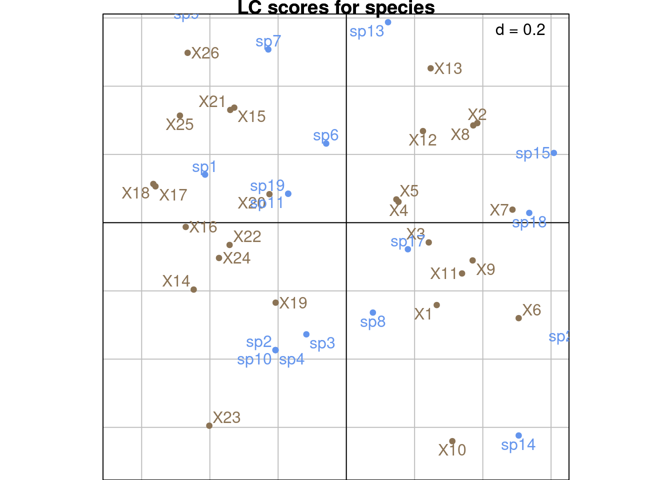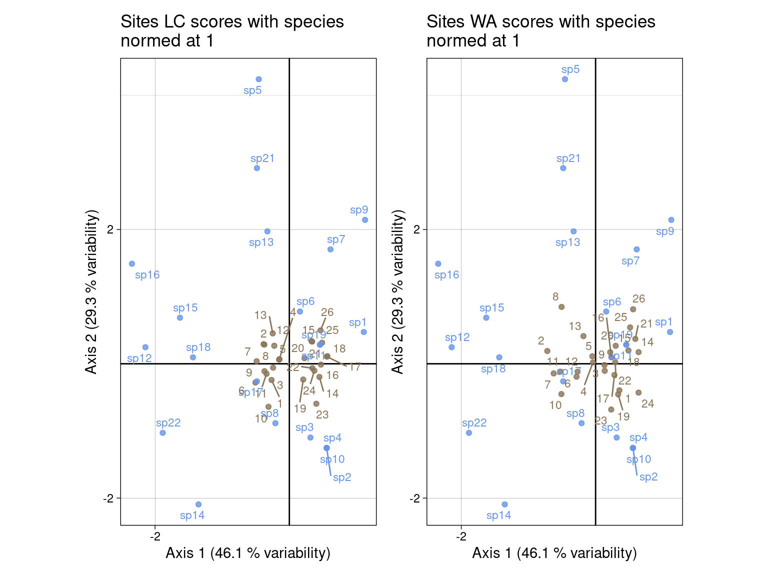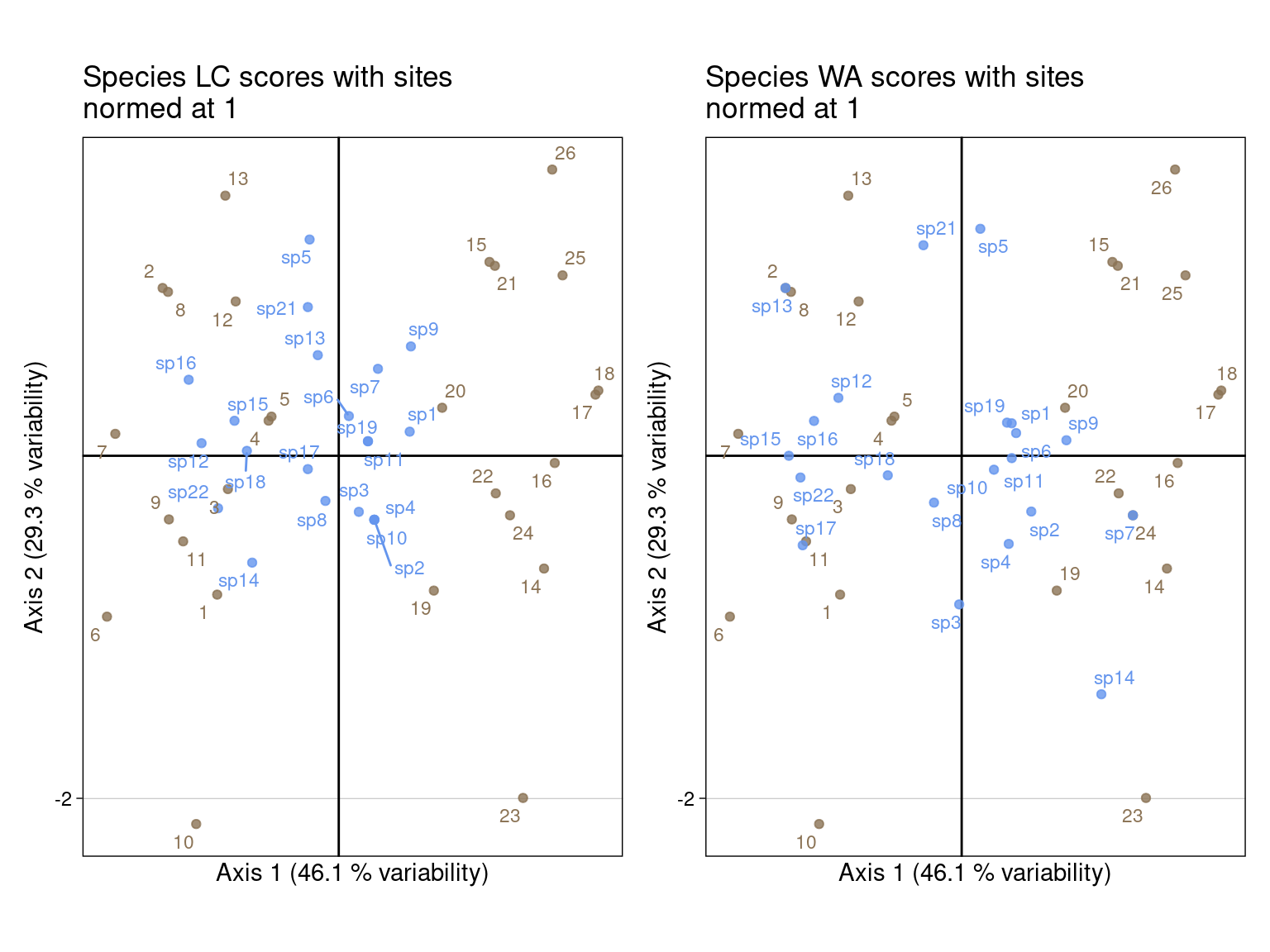We can also define species scores as the mean of sites LC scores (and the reverse):