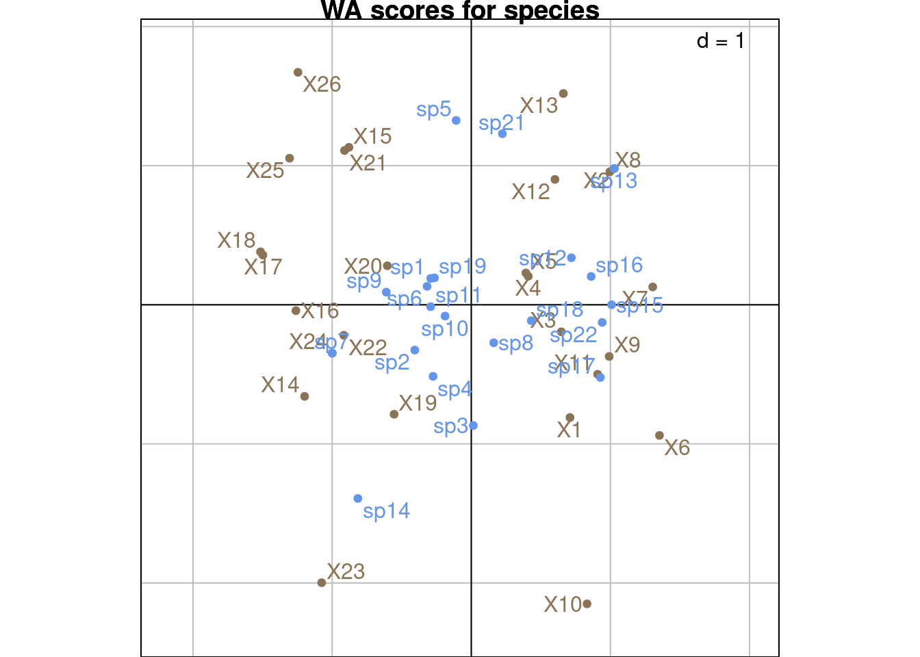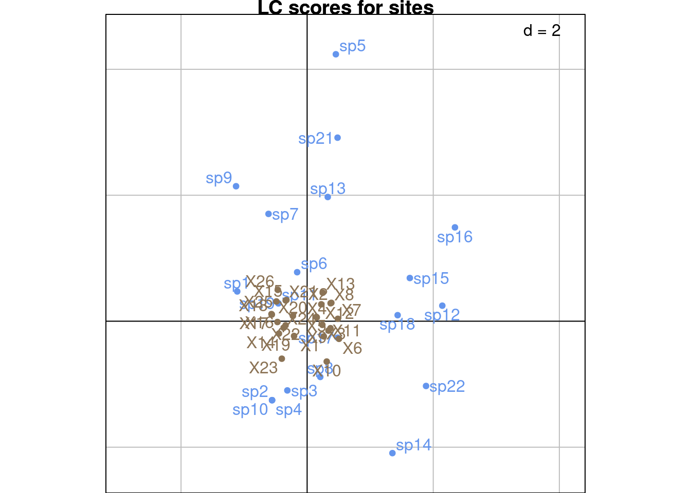 Using the coefficients \(B\) and \(C\), we can now define scores for sites and species scores as a linear combination of their variables: