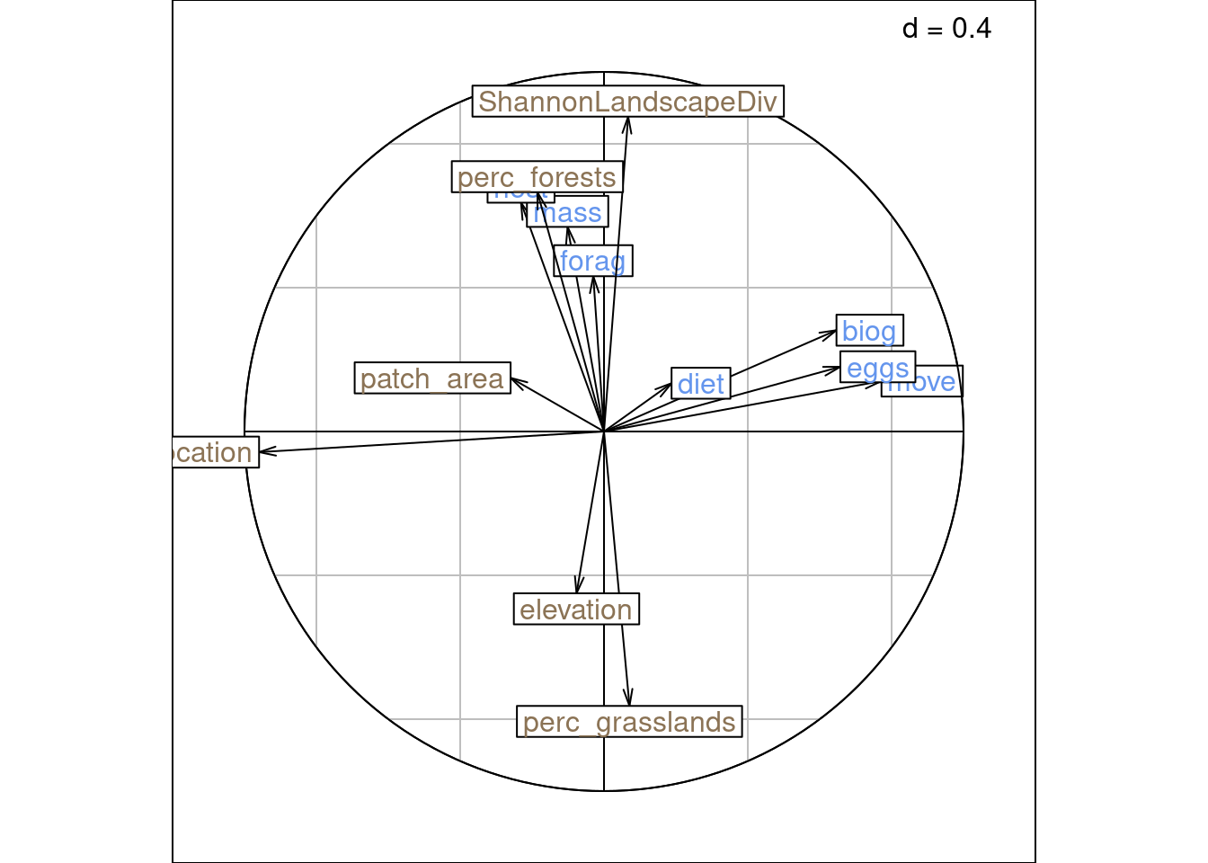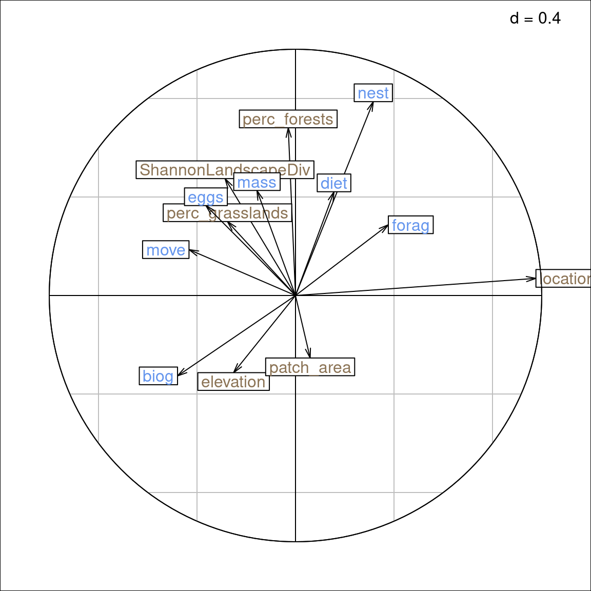 When plotting the correlation circle, to look at the correlations between variables of the same set (traits or environmental variables), we should use \(BS_{B2}\) and \(BS_{C1}\). There are the scores returned by ade4.