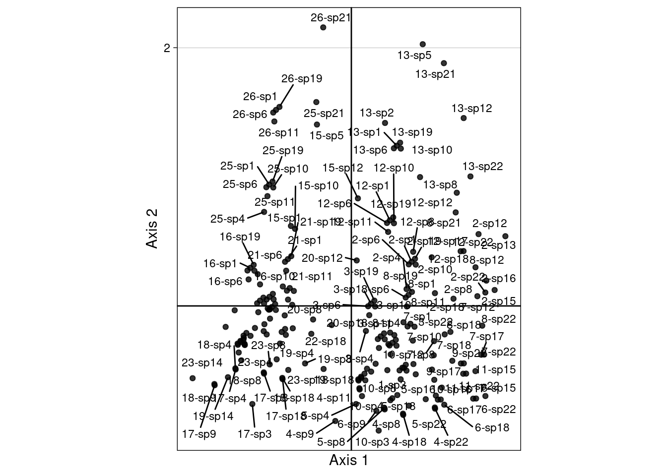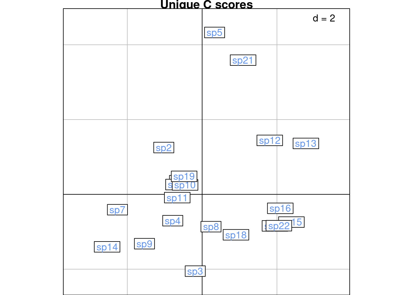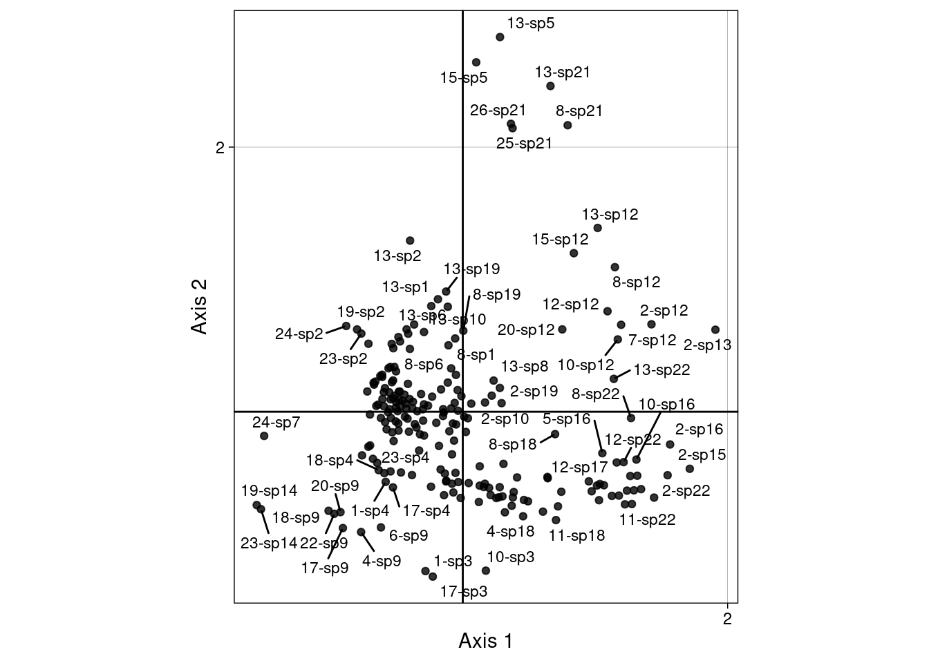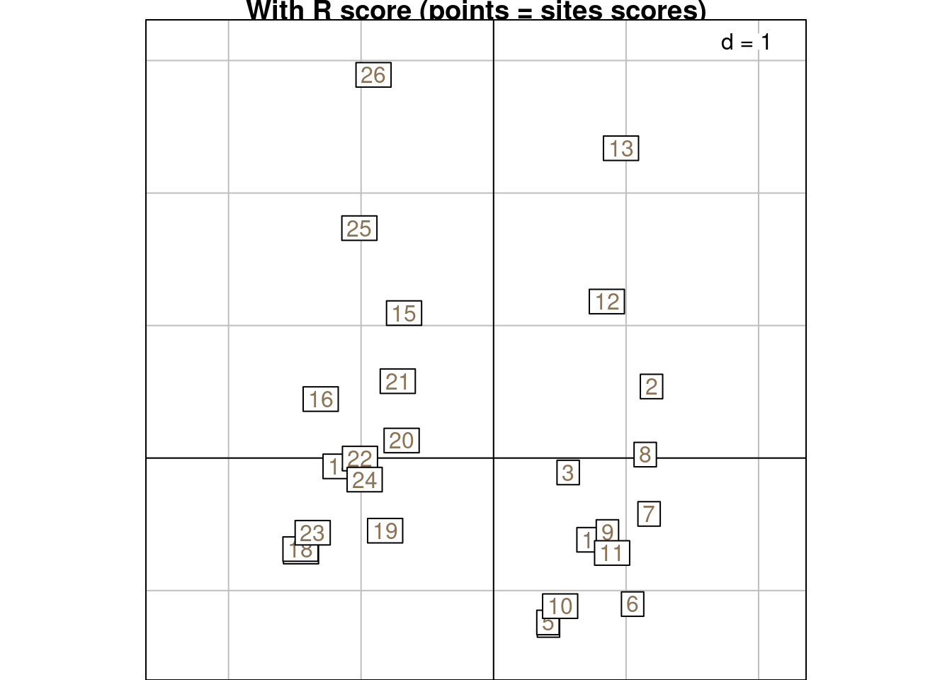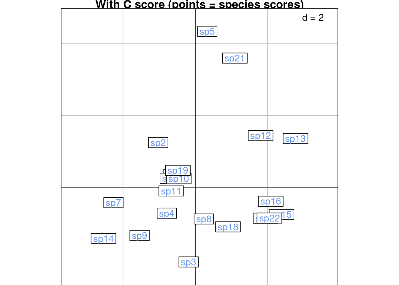 From canonical correlation analysis We perform the CCorA of tables \(E_{infl}\) and \(Y_{infl}\). The two sets of scores give the correspondences in sites and species space.