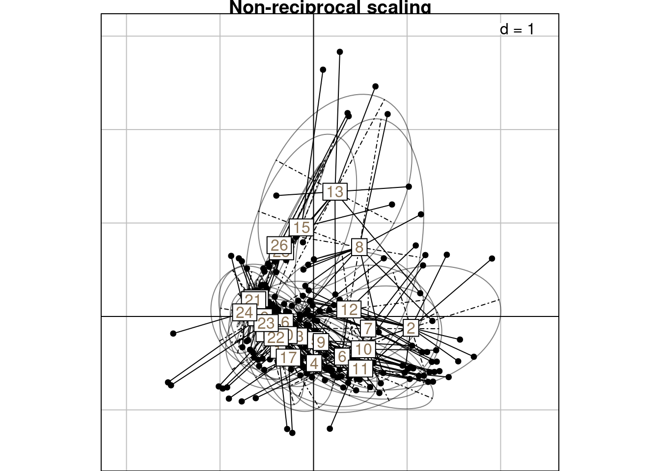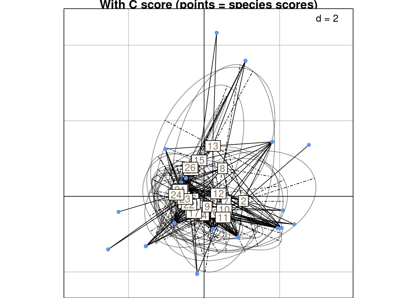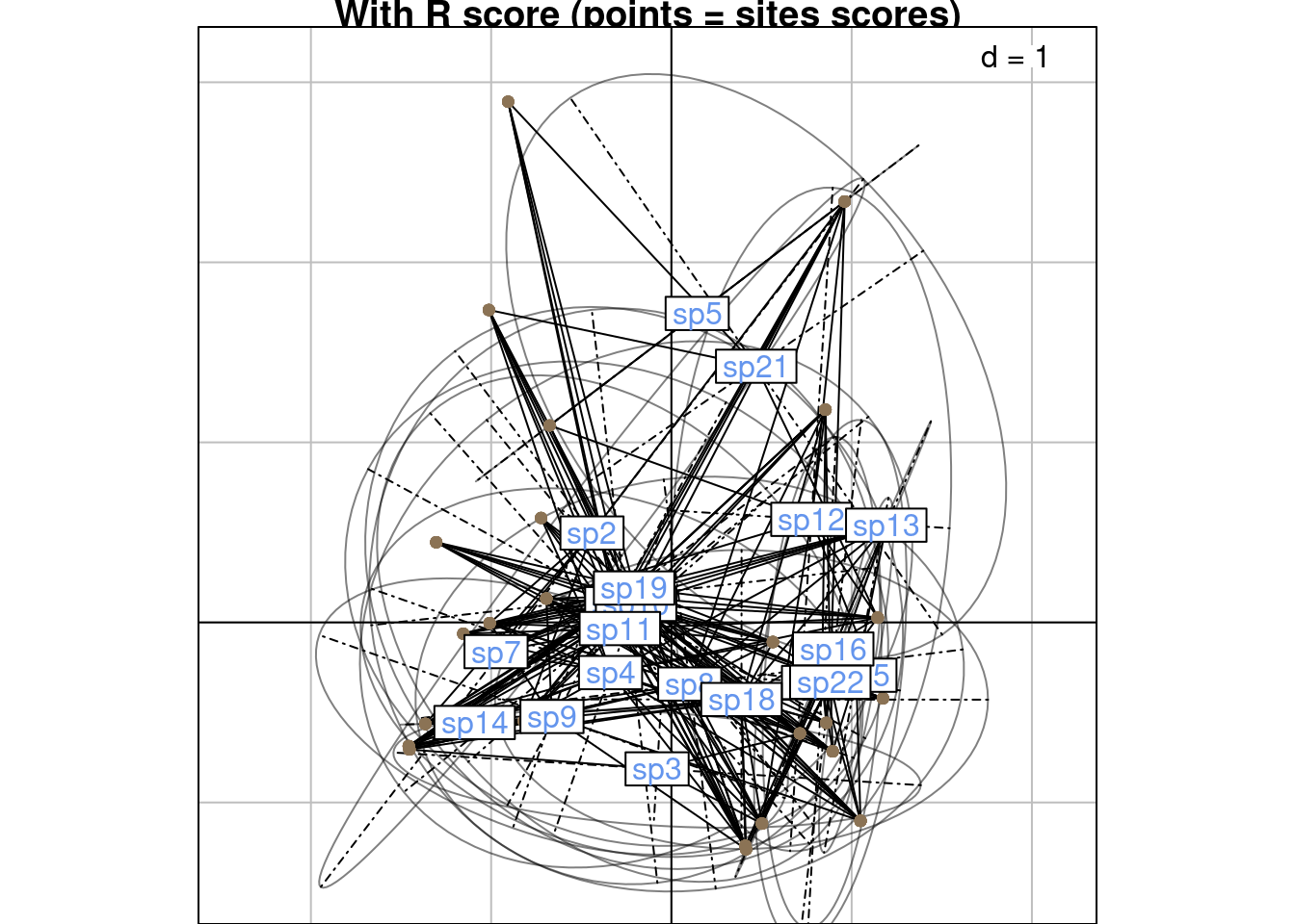 library(CAnetwork)This is an extension of reciprocal scaling defined for correspondence analysis by Thioulouse and Chessel (1992) to canonical correspondence analysis.