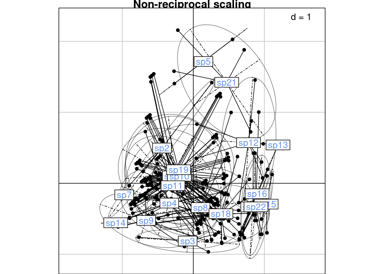 We can remain in the 2 biplots showing \(V\) with \(U^\star\) (c1 and ls) (scaling type 1 = rows niches) and \(U\) and \(V^\star\) (co and l1) (scaling type 2 = column niches).